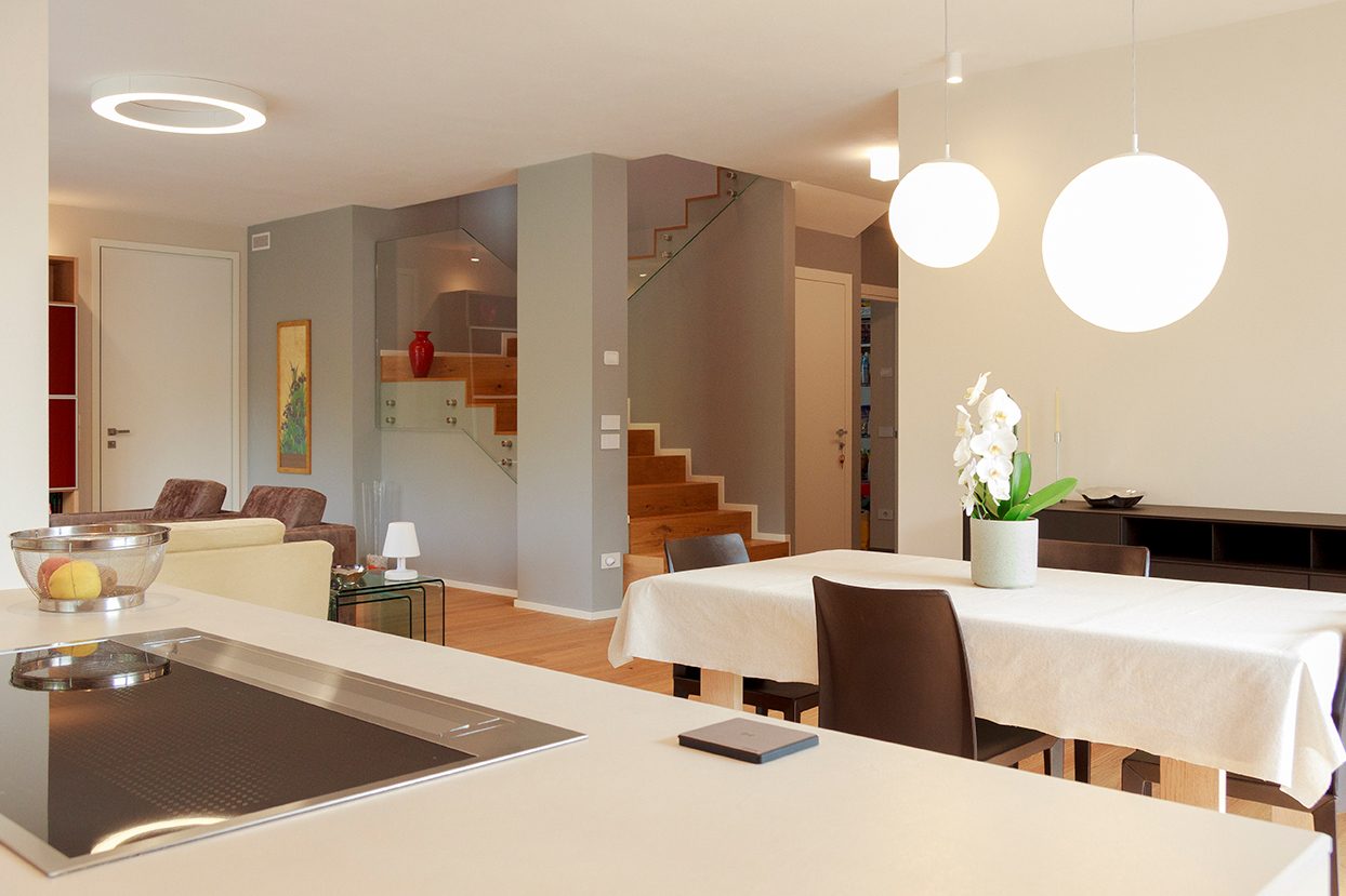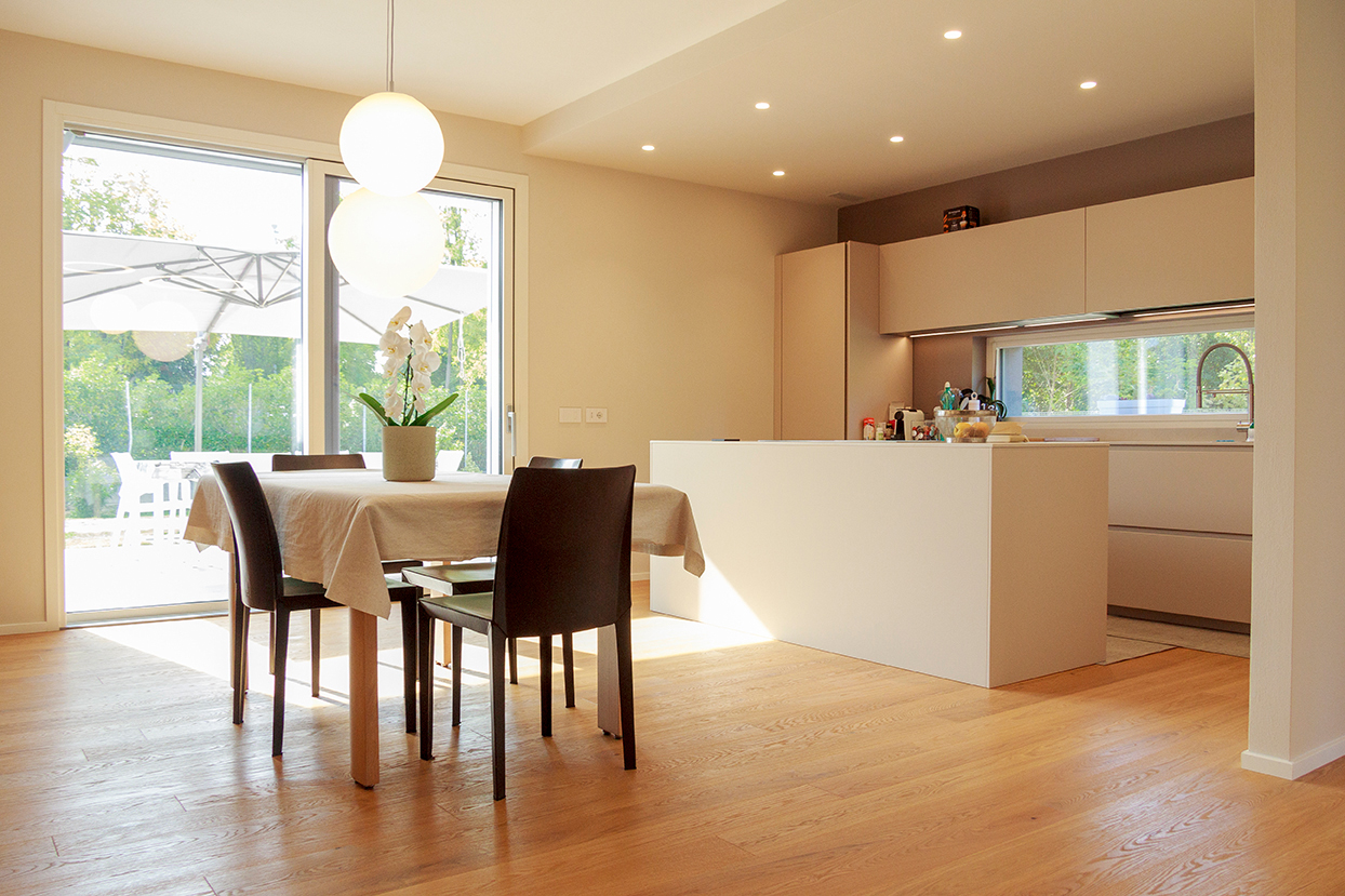 Nuova unifamiliare certificata CasaClima classe A, certificata su committenza e costruita su misura nel comune di Villafranca Padovana. Rivestimenti in legno trattato con oli naturali, serramenti in legno alluminio, arredi interni progettati e curati.